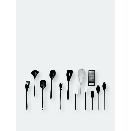– 14 piece set includes: soup ladle, serving spoon, slotted turner, fork, pasta server, mixing spoons, spatulas, whisk, grater, and revolving storage crock