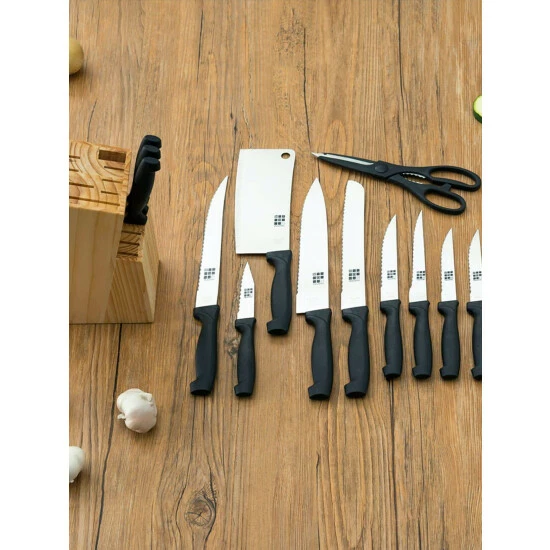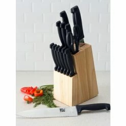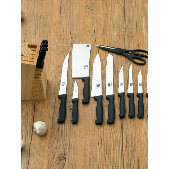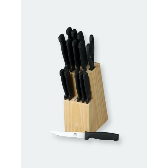 Cut and prepare food like a pro with this 15 piece knife set with block. Made from stainless steel blades with serrated edges. Includes wood display block. Hygienic polypropylene handles for control. Top-rack dishwasher safe.