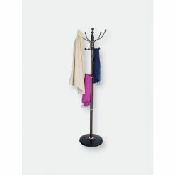 Stylishly elegant this standing coat rack brings order and a neat appearance to a home entryway or an office lobby area. With 16 hooks you have plenty of storage to organize clothes, hats and scarves. The 65 inch high center post is supported by a weighted circular base to keep it place. Item dimensions may differ slightly due to the unique nature of the product. Color and finish may also differ from the images shown due to differences in monitor displays. Props and accessories are not included.