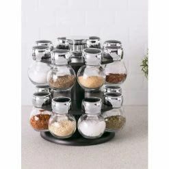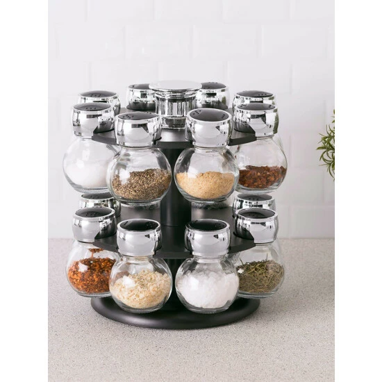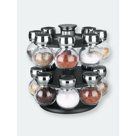 Spice up your kitchen with a modern charm by organizing your favorite, flavorful and aromatic seasonings and herbs in this two tier revolving spice rack.The center knob rotates the base to make it easy to select your favorite spices or herbs. Spices and seasonings not included. The two tier design holds up to 16 glass spice jars. Flip-top lids smoothley dispenses spices in a subtle manner to prevent over pouring. Made of glass and steel.