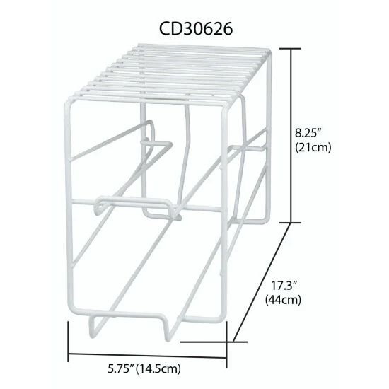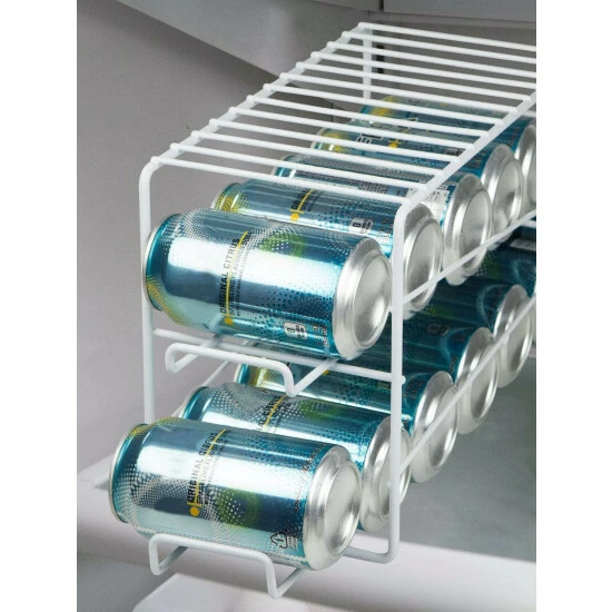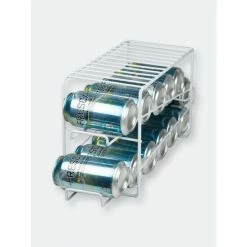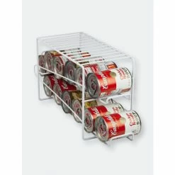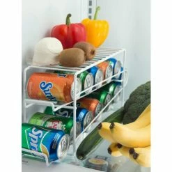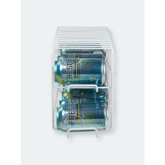 Instead of rummaging through your cramped fridge to grab your favorite soda opt for a specific area within your kitchen pantry or refrigerator to keep your canned food/beverages in place with this metal can dispenser. The two tier design neatly stores up to 11 cans horizontally for easy visibility and organization. Store everything from soda cans, canned soup, vegetables and more. Made of steel, it features a vinyl coated finish to prevent rust.