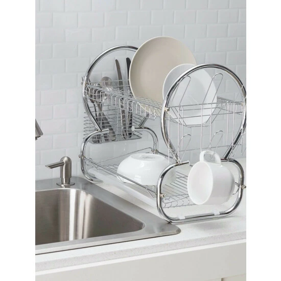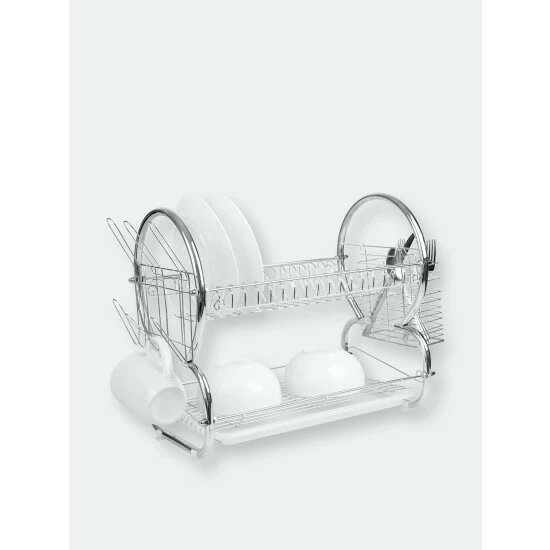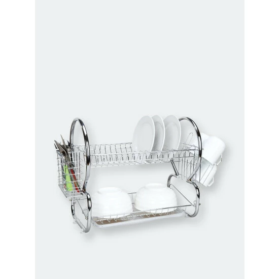 This double decker powerhouse provides ample space for air drying and organize dishware without taking up excess room. The top layer provides a spacious spot to vertically stack plates, while the second layer offers room to line up a row of medium sized mugs or bowls. Additional side storage provides space to stash silverware and hold delicate glasses. The dish rack comes equipped with a bottom drip tray that features a lipped perimeter for keeping excess water from spilling over onto the counter.