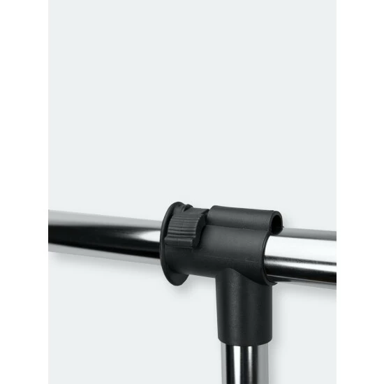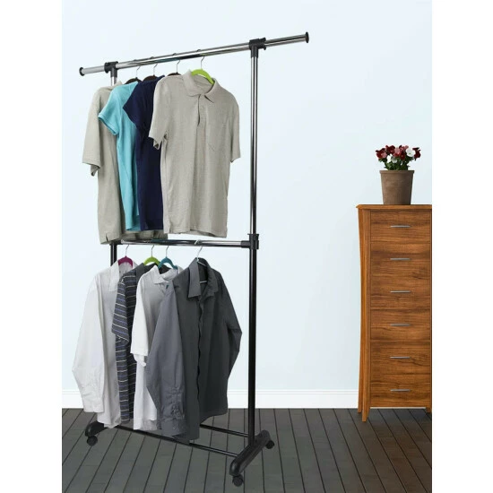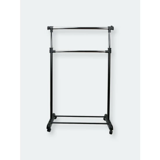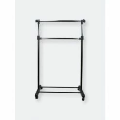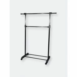 When your teeny tiny closet runs out of space, turn to this 2 tier chrome plated steel garment stand to handle holding your ever-expanding wardrobe. With two levels of storage space, have plenty of room to stow away your off-season apparel or display your everyday ensemble. The clothing rack easily adjusts in height and width from 37 inches to 57 inches to accommodate wider and longer items of clothing like that hefty winter heavy coat, long maxi dress, and snazzy two piece suit. Equipped with plastic wheels, freely move the rack from room to room or indoors and out. Set up is a breeze as there are no tools required to assemble. Just twist the bars in place, and you’re all set to enjoy portable storage. Perfect for business or personal use, this garment rack takes care of organizing your clothing fast and easy whether at home or for that on set photo shoot.