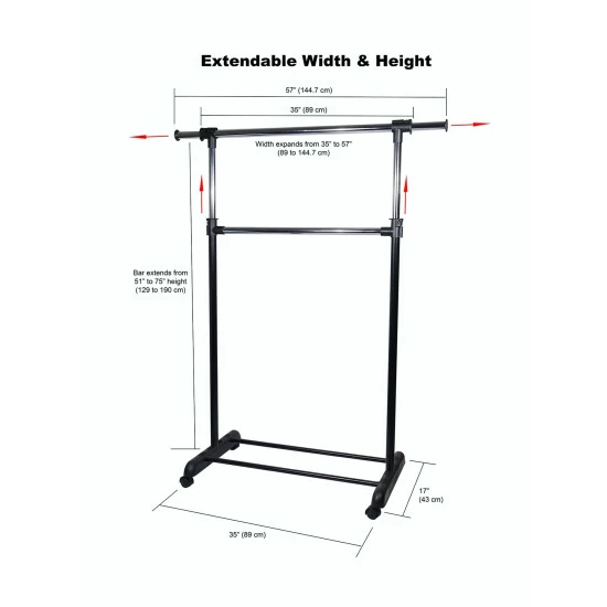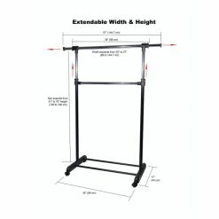 – Two levels of storage to neatly organize clothes with adjustable rods that extend from 35 inches to 75 inches high and 35 inches to 57 inches wide