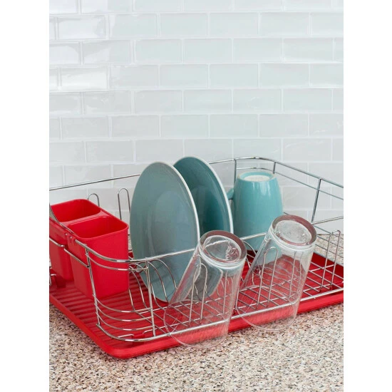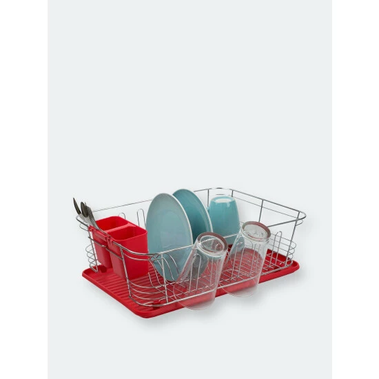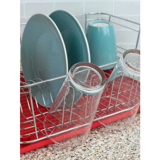 Conveniently sized to fit alongside the countertop this 3 piece dish rack provides enough space to keep your dishes neatly organized after washing. The dish drainer features a plastic draining board with a thick lip that prevents water from spilling over the counter. The divided utensil holder is spacious enough to space to stash silverware and is easily removeable to clean if needed. The dual sided cup holder holds up to 4 glasses upside down for drain excess water more quickly.