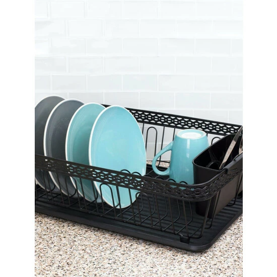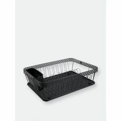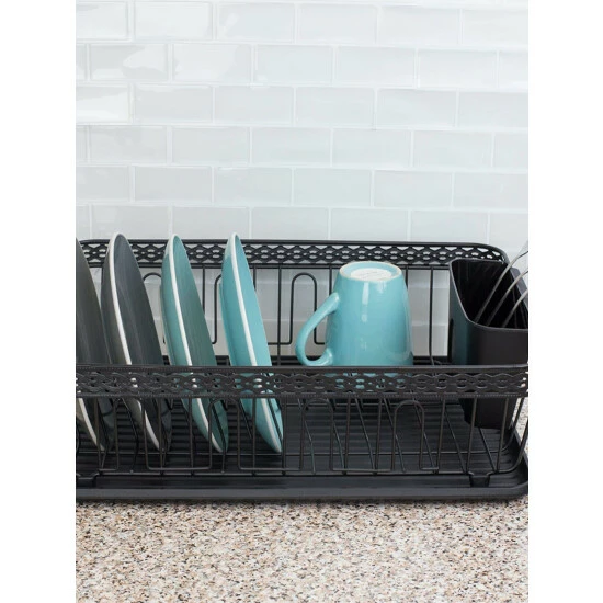 If you’re tired of the traditional stainless steel dish rack, opt to use this decorative steel dish rick in a rich, black finish to dazzle up your dishwashing routine with a dash of elegance. Featuring a solid and open steel frame to it is designed to drain every drip and drop of water from your heavy duty and damp dish load. It also features a larger compartment to neatly stack multiple plates and small compartment to hold up to two mugs. For a dish rack that perfectly combines refined aesthetics and functionality,than there is no better dish rack to display on your counter than this Home Basics Decorative Steel Dish Rack.