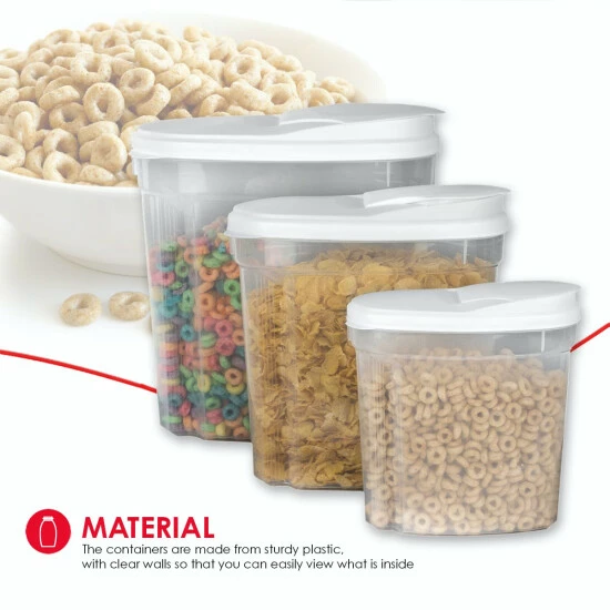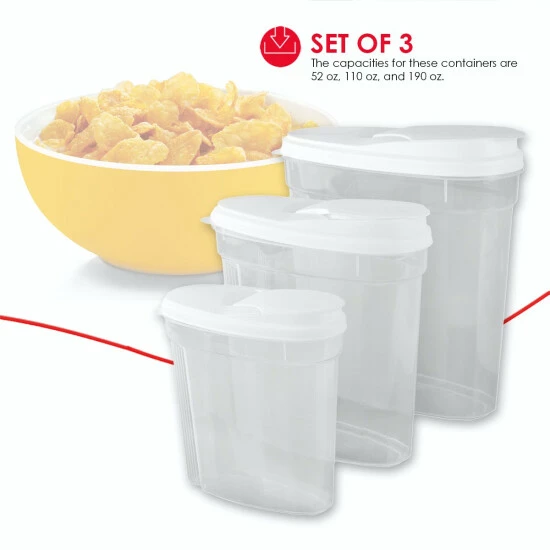 Crunchy or crispy. Sweet or savory. Store all of your dry foods in these plastic containers. The flip-open lids make it a snap to open and pour, while the clear base provides easy visibility. Display it in a pantry or on a counter to prevent cabinet clutter. Use these for not only storing food, but to place pens, pins, clips, and small hardware. The capacities for these containers are 52 oz, 110 oz, and 190 oz.