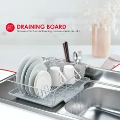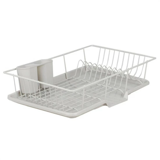 We understand drying stacks upon stacks of dirty dishes and wiping countertops down dry after washing is a big enough chore as it is. Which is why we made this convenient and stylish dish rack to help get this unnecessary burden off your plate with this 3 piece vinyl coated steel dish drainer. Eight evenly space slots let you neatly stack plates for drying or displaying, while the two compartment cutlery holder with perforated bottoms provide an organized way to air dry or showcase silverware. The dishrack also provides ample space to store mugs, cups, glasses, and bowls, as well as a sloping tray for excess water to transfer directly to the sink and away from your countertops.