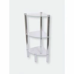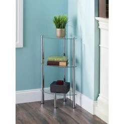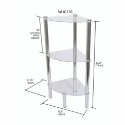 Add a contemporary touch, while reclaiming more space from that unused corner in the home or office with this standing tiered glass corner shelf. Featuring sleek temperd glass tier with metal posts, it’s the perfect piece to create a sophisticated vignette to showcase all your essentials and personal items you cherish. Use it in the bathroom to organize toiletries. Or place it in the corner of kitchen to prevent cabinet clutter. This multi-purpose shelf is incredibly useful for displaying books, antiques, vases, framed prints and decorative collectibles. Rest it against a stark white wall for a luxe and classic look. The shelf looks equally great against a wall in a contrasting hue if you’re looking to add more visual interest to your space. Item dimensions may differ slightly due to the unique nature of the product. Color and finish may also differ from the images shown due to differences in monitor displays. Props and accessories are not included.