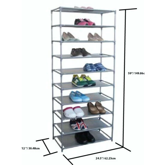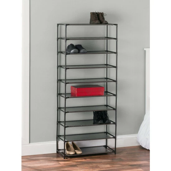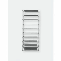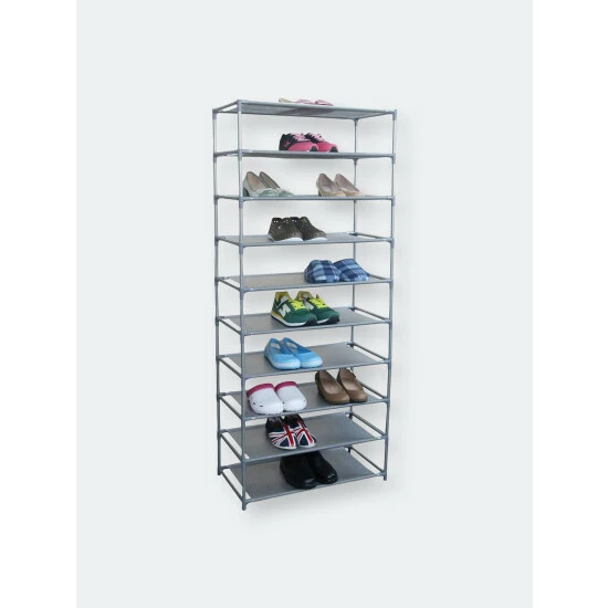 Free up your floor space, while bringing your urban modern, rustic, or industrial style home together with this 10 shelf shoe rack. This multi-level shoe organizer features a metal frame with a neutral matte grey finish to coordinate with a variety of spaces. Open non-woven shelves make it easy to find the pair of shoes you need , while also promoting air flow to limit the amount of unpleasant odors that can emit from used shoes. Whether you’re looking to ensure those posh pumps don’t become Fido’s afternoon snack or looking to ensure your teen’s tennis shoes are no scattered across your polished floors, this shoe rack Each non-woven shelf is slip-resistant to ensure your footware collection remains neatly in place for all to admire.