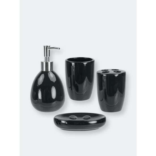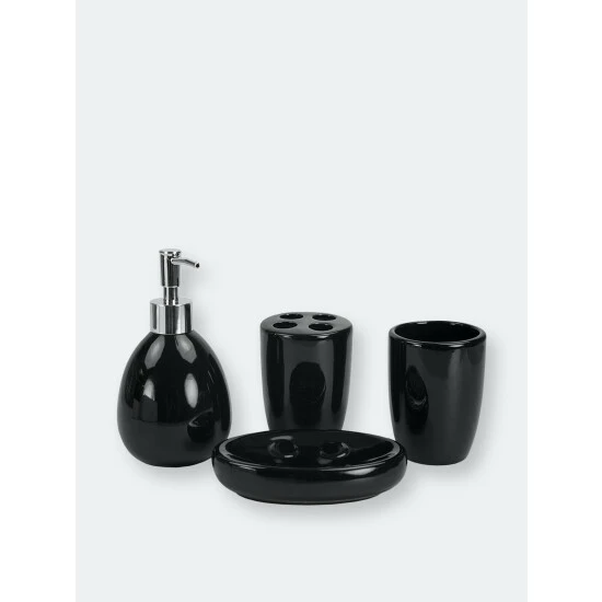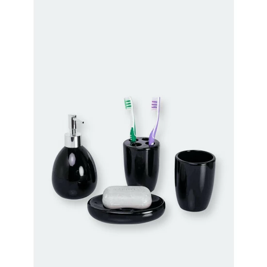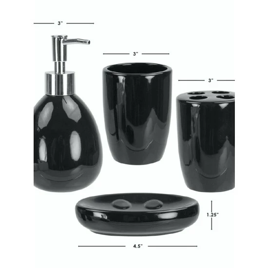Grace your bathroom vanities with a modern flair by displaying this four piece contemporary bath accessory set. This set includes all the essentials to get you through your routine. From the rounded lotion dispenser with durable stainless steel pump for easy dispensing, generous size tumbler for rinsing or drinking, a large soap dish to store your favorite bar of soap, and 4 slot toothbrush holder to keep your toothbrushes organized. The beautiful matte finish and a simple design coordinates perfectly with virtually any bathroom style. Whether you need to dispense your favorite silky smooth and delightly fragrant lavender scented lotion or need to stylishly store away your toothbrush after cleaning that million dollar smile, this set provides the perfect blend of functionality and timeless style to your bathroom.