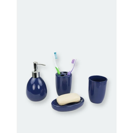 Grace your bathroom vanities with a modern flair by displaying this four piece contemporary bath accessory set. This set includes all the essentials to get you through your routine, from the rounded lotion dispenser with durable stainless steel pump for easy dispensing, generous size tumbler for rinsing or drinking, a large soap dish to store your favorite bar of soap, and 4 slot toothbrush holder to keep your toothbrushes organized. The beautiful matte finish and a simple design coordinates perfectly with virtually any bathroom style. Whether you need to dispense your favorite silky smooth and fragant lotion or need to stylishly store away your toothbrush after cleaning that million dollar smile, this set provides the perfect blend of functionality and timeless style to your bathroom.