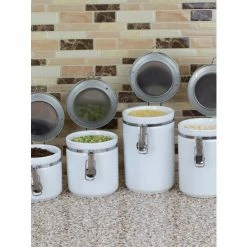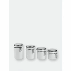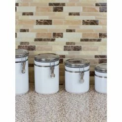 Store flour, trail mix, and more with this Home Basics Canister Set. Made of heavy duty ceramic with stainless steel tops, it features sturdy metal clamps that provide airtight seal to ensure food remains fresh and flavorful. The 4 piece set comes in a wide range of sizes for added versatility.