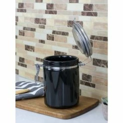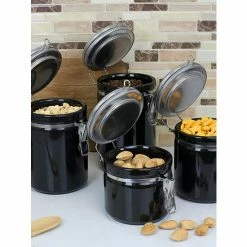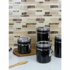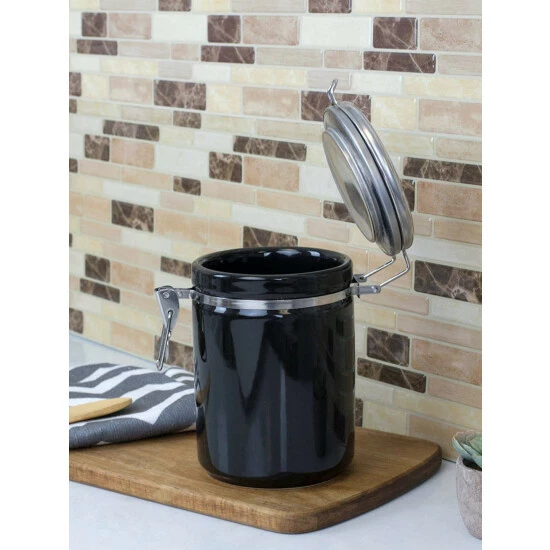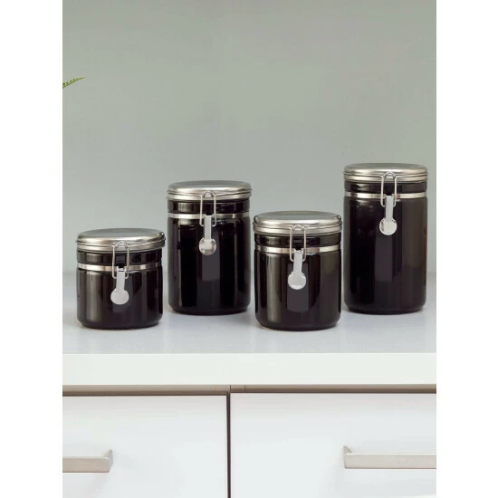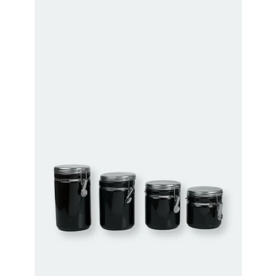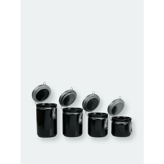 Store flour, trail mix, and more with this Home Basics Canister Set. Made of heavy duty ceramic with stainless steel tops, it features sturdy metal clamps that provide airtight seal to ensure food remains fresh and flavorful. The 4 piece set comes in a wide range of sizes for added versatility.