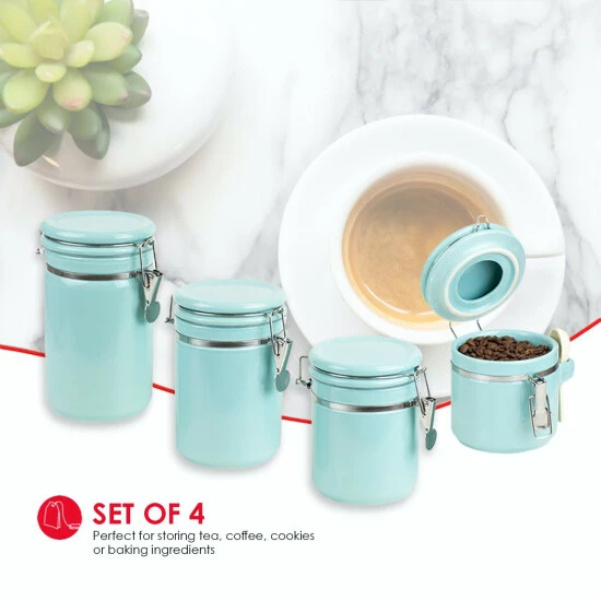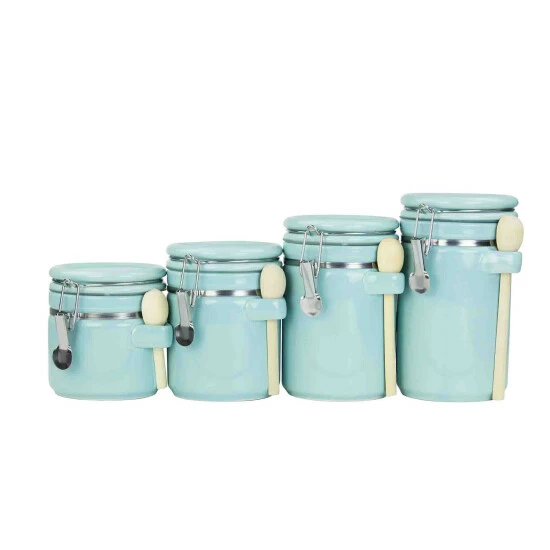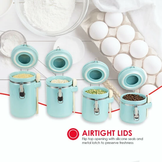 If you want a set of canisters to perk up your countertops with a modern touch while keeping your dry foods neatly preserved and fresh.. look no further than this ceramic canister set. The set of four includes 25 oz, 33 oz, 40 oz, and 45oz containers with wooden spoons for easy scooping. Each canister is crafted of durable ceramic and features a vivid finish that lends a contemporary look to the kitchen. Use it to store coffee, flour, beans, and trail mix. Or they can hold candies, cookies, pretzels, and other yummy treats for easy access if you do not want to keep them in the pantry. These compact canisters are conveniently sized to fit on countertop, bar cart or island. Each canister is equipped with air-tight seals and sturdy steel latches that lock in all the contents inside. These items can also hold items outside of the kitchen such as rubber bands, nails and screws, craft supplies, and so much more for easy convenience.