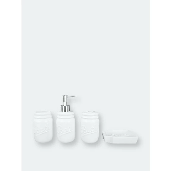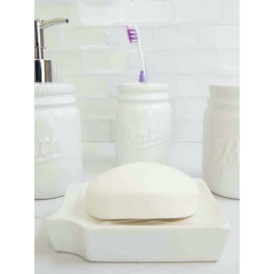 Whether for your master or guest bathroom, this 4 Piece Dolomite Bathroom Accessory Set set features a simple silhouette and neutral color scheme that will coordinate seamlessly with your modern style décor. This 4 piece bath ensemble features a glazed dolomite finish with the words “Bath” in an elegant script on each piece. This set includes all the essentials to get you through your routine, from the traditional shape lotion dispenser with a durable stainless steel pump for easy dispensing, generous size tumbler for rinsing or drinking, a large soap dish to store your favorite bar of soap, and double slot toothbrush holder to keep your toothbrushes organized. Whether you need to dispense your favorite silky smooth and fragrant lotion or need to stylishly store away your toothbrush after cleaning that million dollar smile, this set provides the perfect blend of functionality and timeless style to your bathroom.