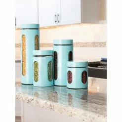 Store candy, sugar, trail mix and more with this 4 piece Canister Set. Made of heavy duty steel, it features a clear window along the center of the base to allow you easily see the contents of each canister. The vibrant finish adds a splash a color to your kitchen and provides a fun way to neatly organize your food.