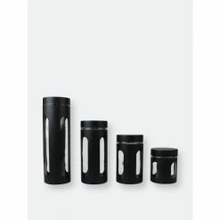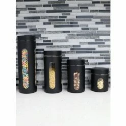 Put an end to countertop clutter with these set of stainless steel canisters. Each canister is made from premium quality stainless steel with a smooth easy to clean finish. The canisters feature multiple clear glass windows, so you can get a quick glance at what is inside the containers without having to remove the top. The set includes a small, medium, large and extra large canisters with the following storage capacity: 23 Oz. 33 Oz, 50 Oz, 67 Oz.