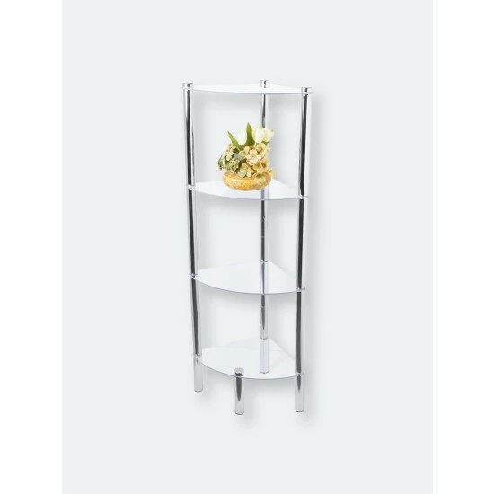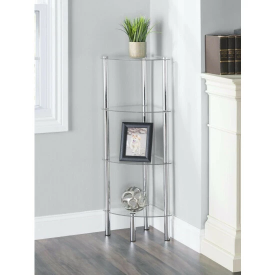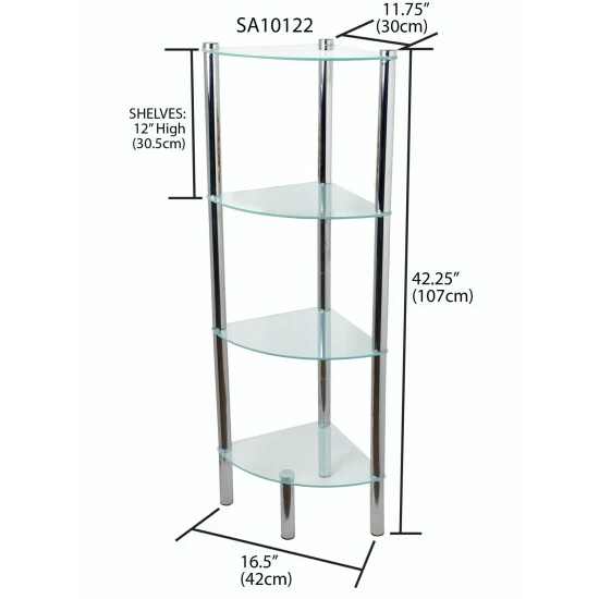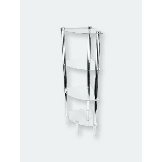 Add a contemporary touch, while reclaiming more space from that unused corner in the home or office with this standing tiered glass corner shelf. Featuring sleek temperd glass tier with metal posts, it’s the perfect piece to create a sophisticated vignette to showcase all your essentials and personal items you cherish. Use it in the bathroom to organize toiletries. Or place it in the corner of kitchen to prevent cabinet clutter. This multi-purpose shelf is incredibly useful for displaying books, antiques, vases, framed prints and decorative collectibles. Rest it against a stark white wall for a luxe and classic look. The shelf looks equally great against a wall in a contrasting hue if you’re looking to add more visual interest to your space. Item dimensions may differ slightly due to the unique nature of the product. Color and finish may also differ from the images shown due to differences in monitor displays. Props and accessories are not included.