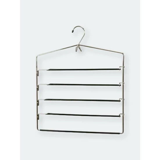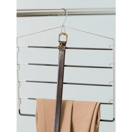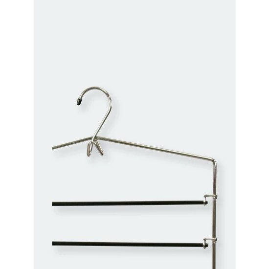 – Designed to Love and Last: Made of durable chrome plated steel with non-slip rubber bars, this space saving hanger accomodates up to four pairs of pants in the amount of space that would be typically occupied by one hanger.