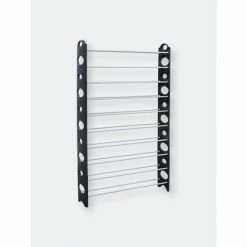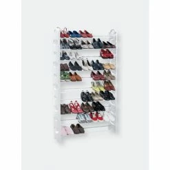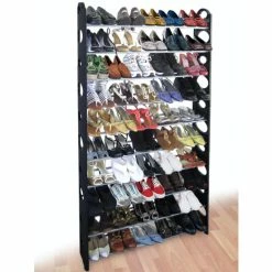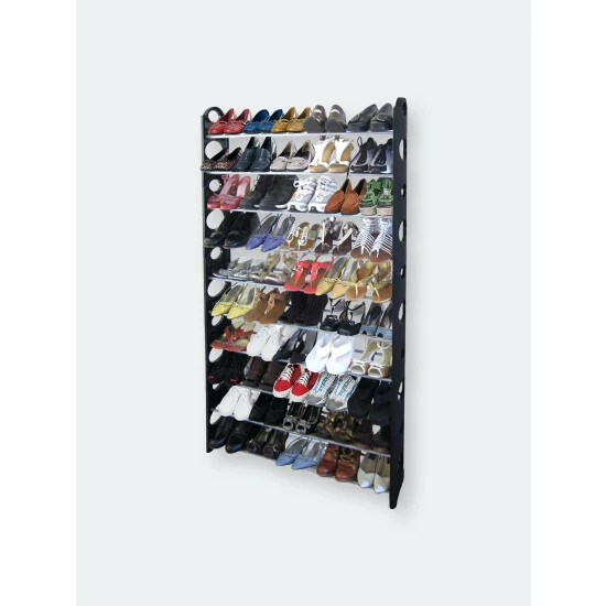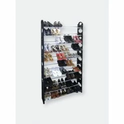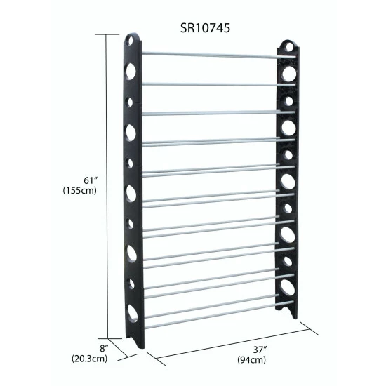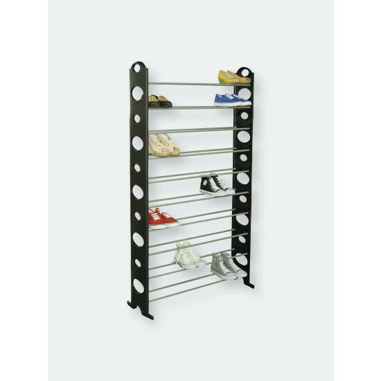 Designed with high strength metal rods and sturdy plastic attachments this tiered free standing shoe rack can accommodate up to 50 pairs of shoes. Varying size holes on each side allow to adjust the distance between shelf to accommodate different types and sizes of shoes. The open style shelving allows you to see your collection in a quick glance, while also keeping your shoes well-ventilated. Step, by instructions included for quick set up right out of the box. Spot clean.