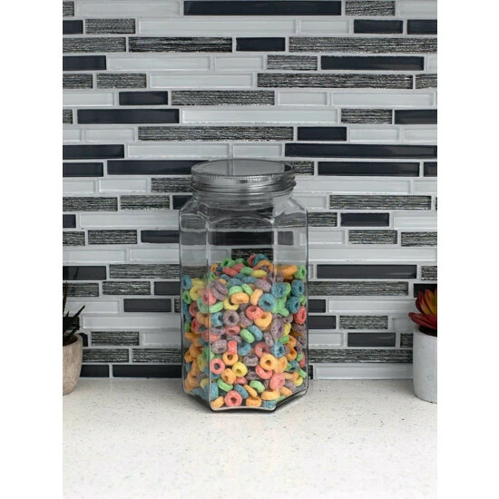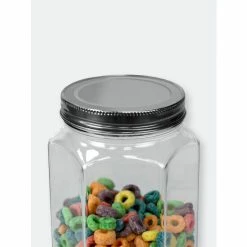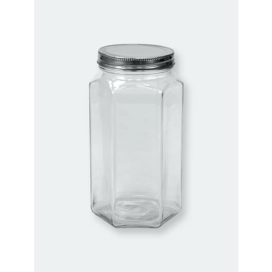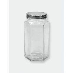 A unique take on the traditional glass jar and canister, this beautiful storage container features hexagon shape base that gives all your kitchen staples and favorite foods a gourmet look. The hexagon glass jar is toped with a snug-fit metal twist-on lid that keeps all the freshness inside. Great for cannning, use to store and jams, honey, and baby food. Or use to the stash herbs, spices, flours, and other dry ingredients. Fill it with candy or essentials for the perfect homemade gift or party favor.