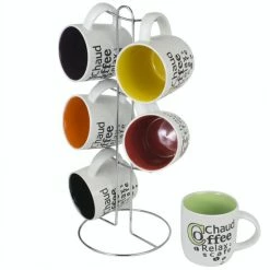 Your days just got brighter now that you have this perky hued novelty mug set with metal stand displayed on your countertops. The sleek chrome plated steel stand features angled branches to provide an all-around view of each glaze finished mug, while the rounded ends ensure cups remain in place. Complete with six ceramic mugs, each piece is decked out in bold cafe-inspired prints and paired with zesty colorful accents along the interior of the to make each sip of your morning brew that much more exhilarating. The mugs are also dishwasher safe for easy cleaning as well as microwave safe to use for hot beverages.