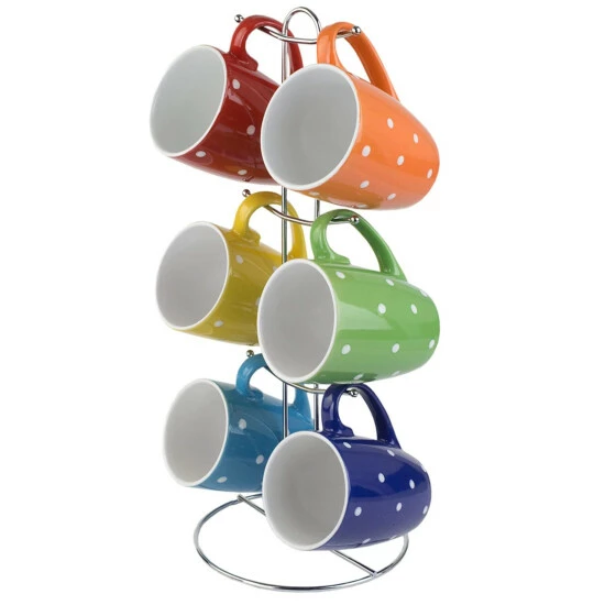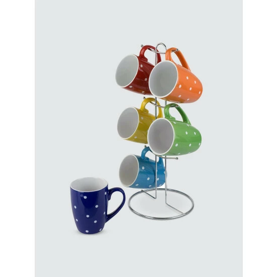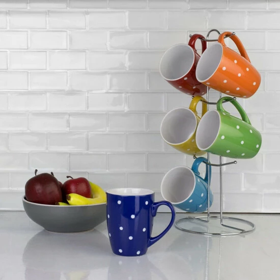 Brighten up your daily morning brew with this perky hued mug set with chrome plate steel stand. Each mug is crafted out of durable stoneware and adorned with a vibrant dots. From a piping-hot cup of cocoa to ice-cold lemonade, these mugs make each sip of your favorite beverages extra exhilarating. Store away each cup on the steady metal stand and place in the center of the table for a beautiful center piece your guests won’t stop wowing about.