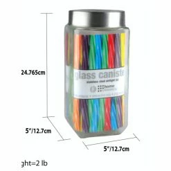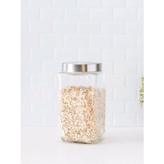 Stock up on these square glass jars to keep your pantry food under control. The square shape fits seamlessly against the back of counter comparted to round canisters. The mouth of jthe ar is wide, making it easy to dip measuring cup inside. The lids form an air-tight seal keeping contents fresh, while the brushed finish makes it a breeze to clean. A great storage container for snacks and cereal, beyond the kitchen these see through glass containers work great at holding hair accessories in the bathroom or storing all your arts and crafts in the kids room.