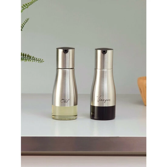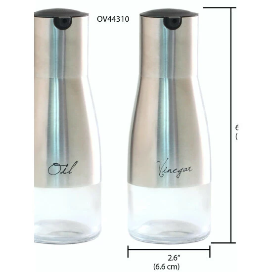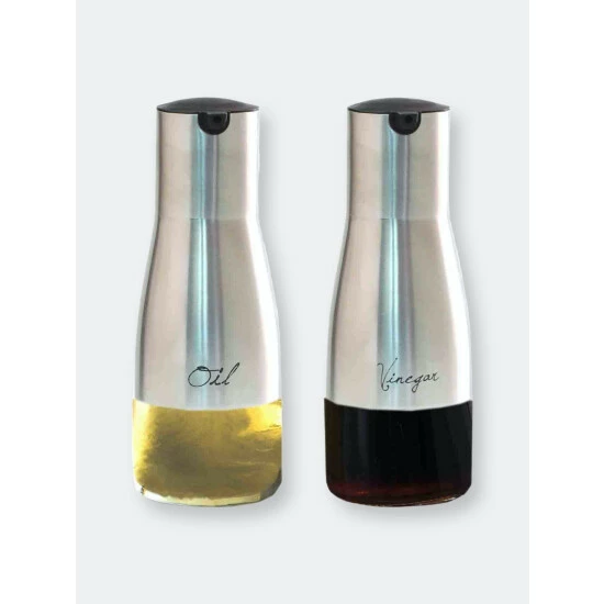 Bring your contemporary table setting together with this elegant styled stainless steel oil and vinegar set. Each shaker holds 8.5oz and measures 7.5 inches in height with elegant scripted labels for easy identification. The air-tight twist open cap keeps food fresh, while the narrow spout provides mess-free dispensing. A transparent glass base graces the bottom of the container makes it easy to monitor the level of condiments within. This set is the perfect addition to the kitchen, perfectly complementing existing stainless steel and modern styled appliances.