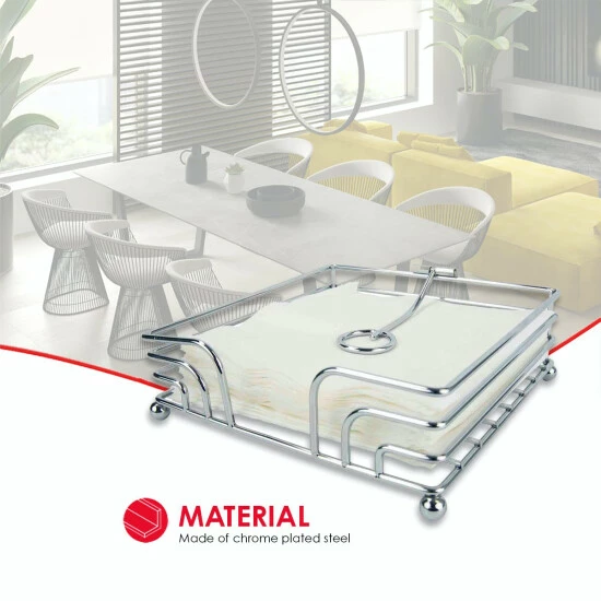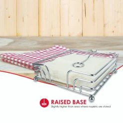 Never worry about napkins flying off your table at your next outdoor cookout and soiree with this steel napkin holder. Neatly nest a stack of napkins in its open base to easily have a napkin readily available to use while dining or cleaning up spills. The weighted pivoted arm locks napkins in place, making them perfect for even the most windiest outdoor picnic. With its gleaming chrome finish and simple design, it works as a perfect functional centerpiece for everyday use, special occasions and both indoors and out.