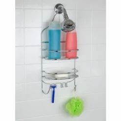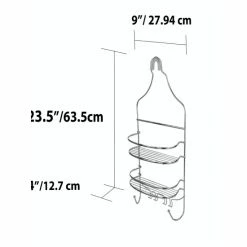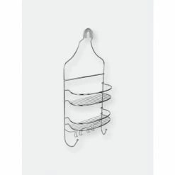 With a sleek, flat wire construction and weighted steel design, this is perfect if you’re looking for a simply elegant shower caddy that takes up minimal room. With no tools required to install, you enjoy having an organized bath right away. The shower caddy features a slip-resistant collar that grasps the shower head snugly with back suction cups that stick firmly to the back of the wall for an additional layer of stability. Your bath accessories remain dry and soap-scrum free thanks to its open frame that allows for efficient draining. Its constructed out of steel wire with a modern chrome finish that will seamlessly coordinate with silver finished fixtures or chrome bath accessories. The shelves are flat and leveled with a top being deep enough to hold large sized bottle shampoos and conditioner while the bottom more narrow to accommodate bar soap. Bottom hooks on the shower caddy allow you to hold razors, brushes, loofahs and bath poufs.