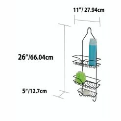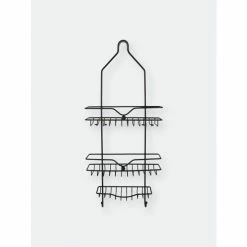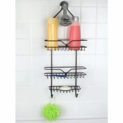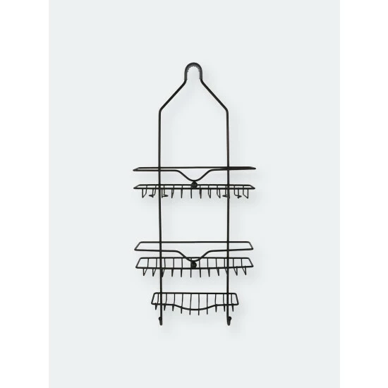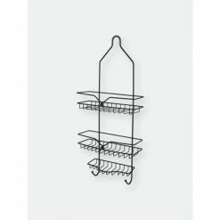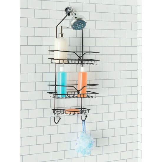 Beautify your bath with a warm inviting touch while having easy access to your shower essentials with this hanging caddy. The solid steel frame keeps it steadily in place, while the rich bronze finish lends a classic look. The two shelves offer plenty of room to stash tall bottled shampoos and conditions with room to spare for small shower gels and accessories. The self-draining soap dish is conveniently located in the middle to keep a bar of soap dry between washes and within your fingertips everytime. Integrated hooks are positioned on the bottom of the caddy, to have multiple razors and loofahs within reach