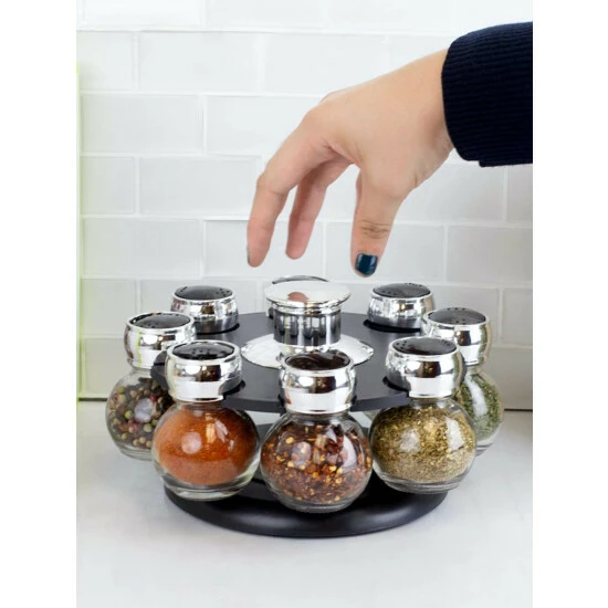 – Smooth spinning action: the racks rests on smooth ball bearings for a smooth and effortlessly turn with a weighted base that keeps it staying in place even when each of the unfilled, durable glass jars are loaded with spices.