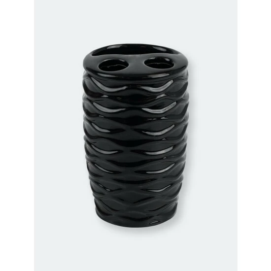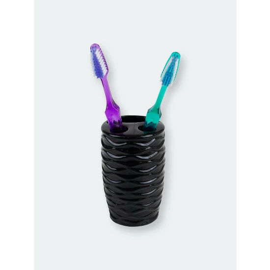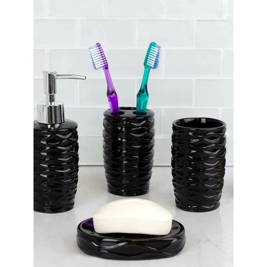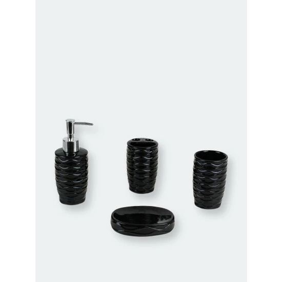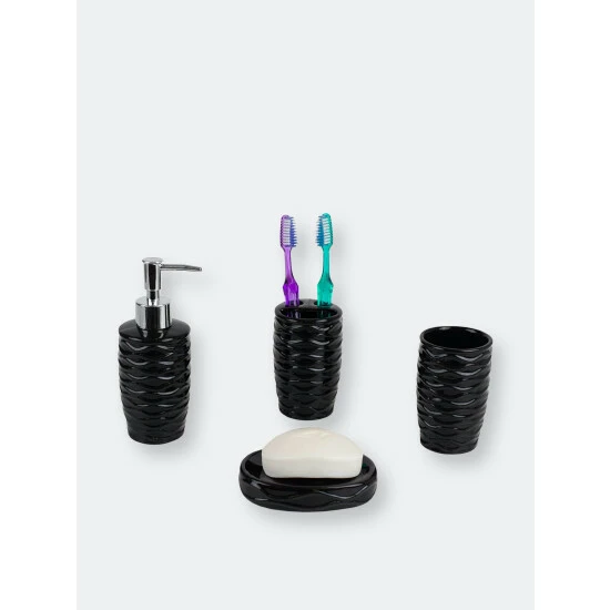 A luxurious bath set that blends luscious curves with an organic design. This 4 piece set comes complete with all the bath essentials to get you ready quickly during the morning rush: a toothbrush holder, tumbler, soap dish, and soap dispenser. Stow regular and electric toothbrushes in the generous sized holder. The lotion dispenser works great at also keeping essential oils and fragrant liquid soaps. Use the multipurpose tumbler for rinsing or for additional storage for office supplies, small beauty products and accessories. Use the soap dish to keep a bar of soap clean and dry. A truly elegant addition, each piece features a solid hue. Accessorize this set by placing each piece with one of our vanity tries to keep your bathroom essentials beautifully displayed and organized. For easy maintenance, simply gently wash the set with mild soap and water