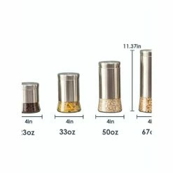 Keep dry food & snacks organized and fresh with this stainless steel jar set. Made from heavy and durable stainless steel with an air-tight lid. Clear glass base to see what is inside. Neatly store your boxed food to prevent cabinet clutter.