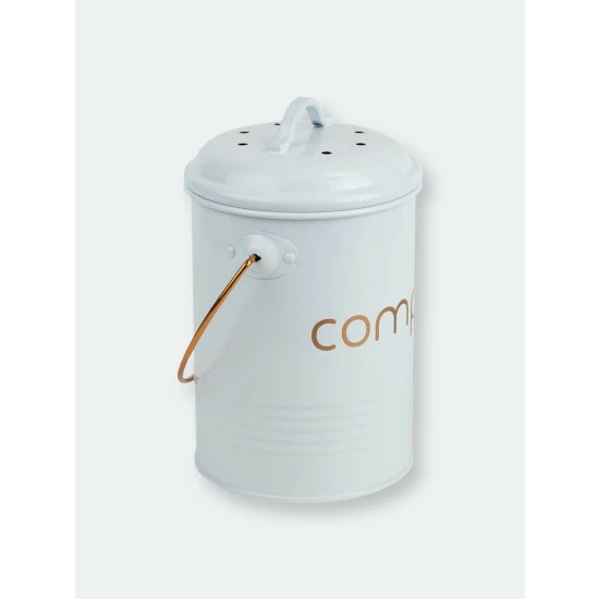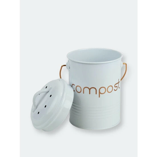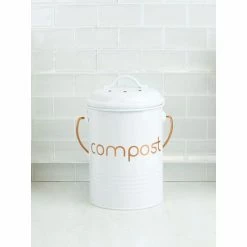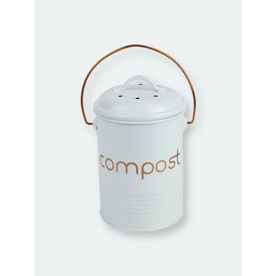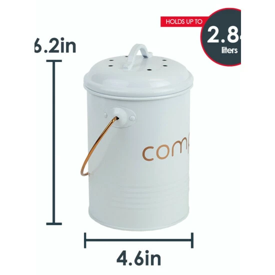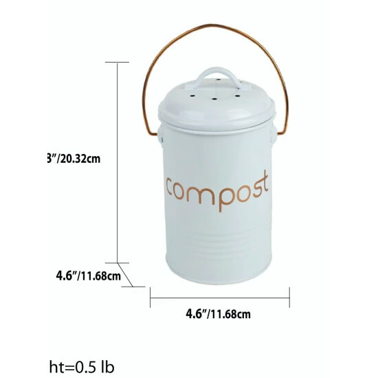 Small enough to tuck away under the sink yet roomy enough to not have to empty it out everyday, the compost bin holds about 2-3 days worth of compostable materials. Use in the kitchen to collect coffee grounds, fruit and vegetable peelings and other food scraps. Or use it outdoors for flowers, tea leaves. The lid fits firmly in place to prevent any odors from escaping the bin, yet still loose enough to remove the top with one hand. The compost bin has a capacity of .75 gallons/2.84 liters. Made from high quality tin with thick walls for long-lasting durability. The bin can be lifted and carried from one location to the next with its built-in handle. Item dimensions may differ slightly due to the unique nature of the product. Color and finish may also differ from the images shown due to differences in monitor displays. Props and accessories are not included.