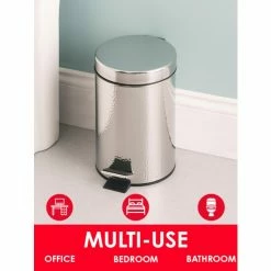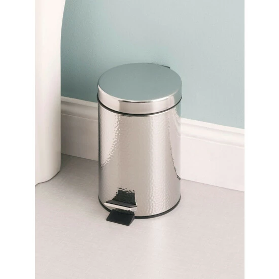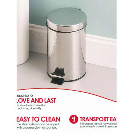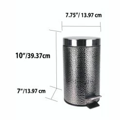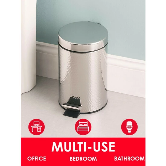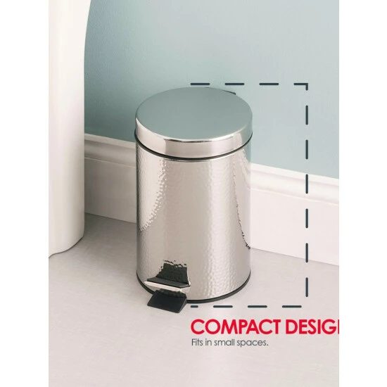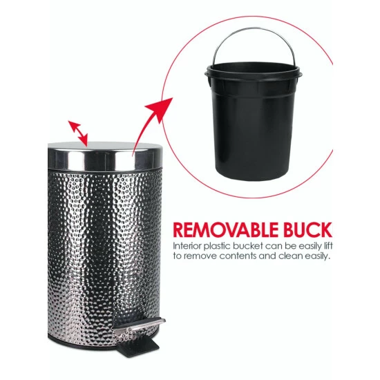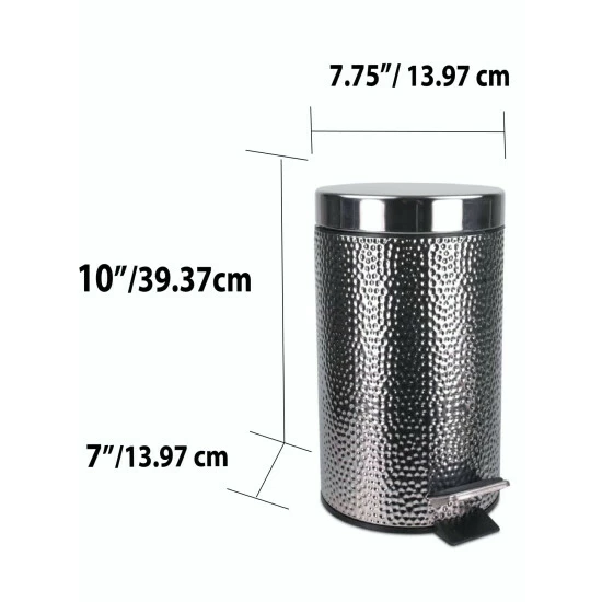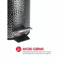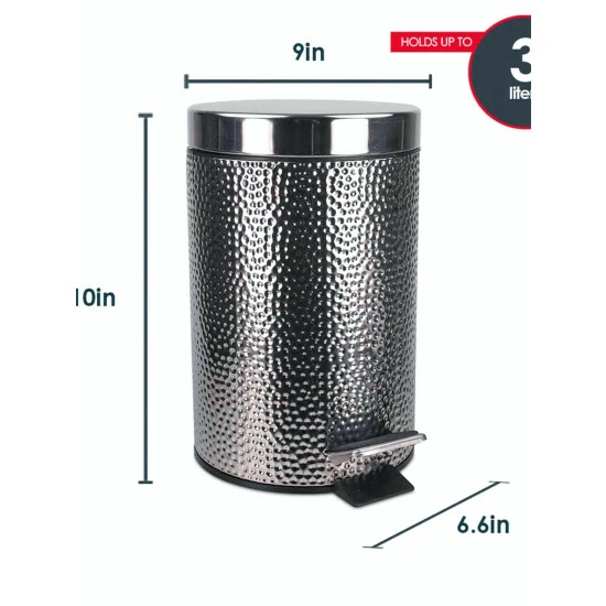 Keep any room in the house free of trash with this step waste bin. Made of stainless steel with a hammered finish. 3 Liter capacity. Fully-integrated step pedal operated lid to keep germs off your hands. Non-skid base keeps the bin in place when using the step pedal.