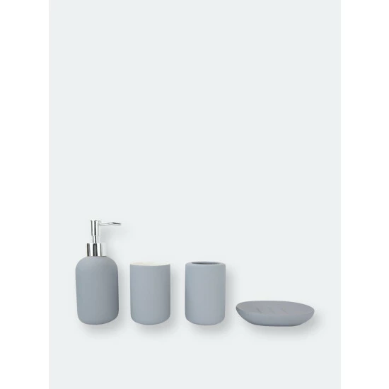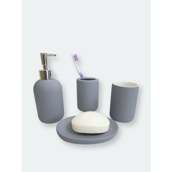 Whether for your master or guest bathroom, this 4 Piece Rubber Bathroom Accessory Set features a simple silhouette and neutral color scheme that will coordinate seamlessly with your modern style décor. This 4 piece bath ensemble is made of a ceramic with a durable rubber encasing that provides a comfortable grasp when in use. This set includes all the essentials to get you through your routine, from the traditional shape lotion dispenser with durable stainless steel pump for easy dispensing, generous size tumbler for rinsing or drinking, a large soap dish to store your favorite bar of soap, and double slot toothbrush holder to keep your toothbrushes organized. Each piece is covered in a rubberized encasing for a comfortable grasp. Whether you need to dispense your favorite silky smooth and fragrant lotion or need to stylishly store away your toothbrush after cleaning that million dollar smile, this set provides the perfect blend of functionality and timeless style to your bathroom.