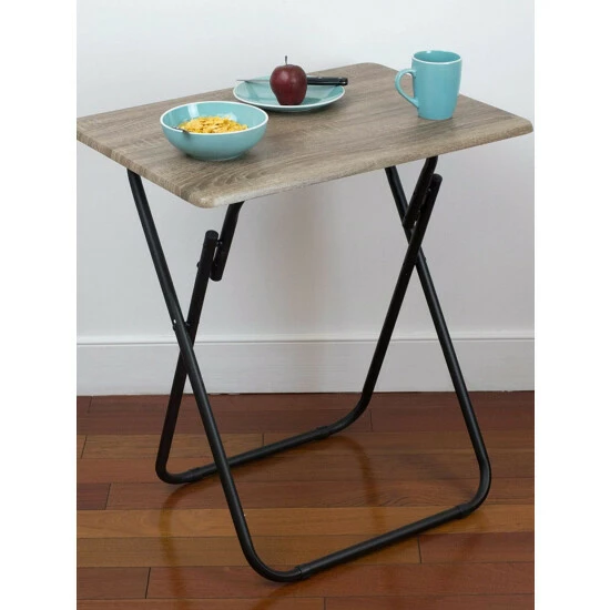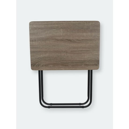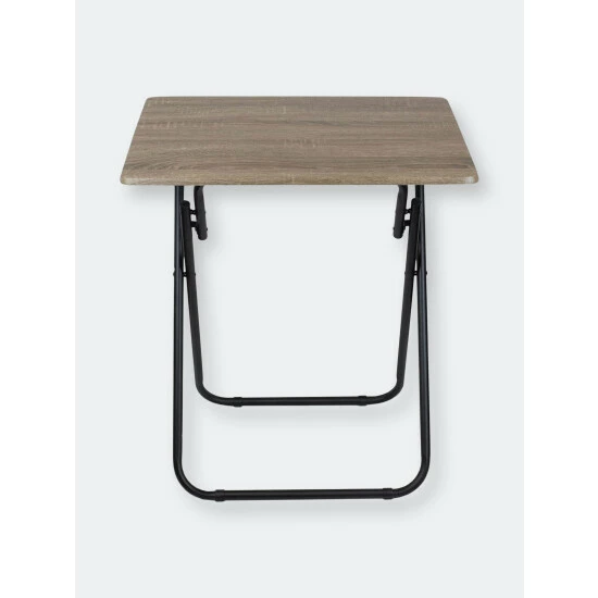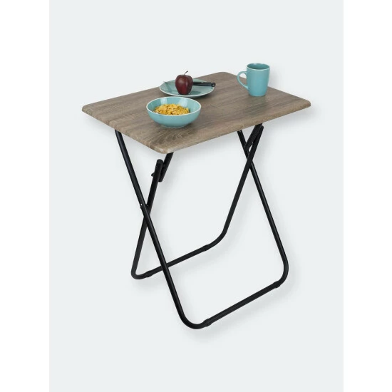 A portable table whenever and wherever you need it. Looking to change it up and enjoy your meal Prop it in front of the television, so you’ll never miss a minute of your favorite show or movie. The top features a wide surface area to easily accommodate a full-size plate, utensils, a glass of your favorite beverage, with room to spare to keep your remote close at hand and your phone within your grasp. Or use it for extra serving space to display a colorful array of hors d’oeuvres outdoors. No wobbling whatsoever with this high-end table! It’s crafted of solid wood and rests on sleek, but sturdy stainless steel legs that enable it to be used on a variety of floor surfaces. In addition to its durable construction, it features a richly grained designed surface top with a simple silhouette that will enhance any décor. The table folds flat in a sleek footprint to conserve precious storage space.
