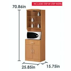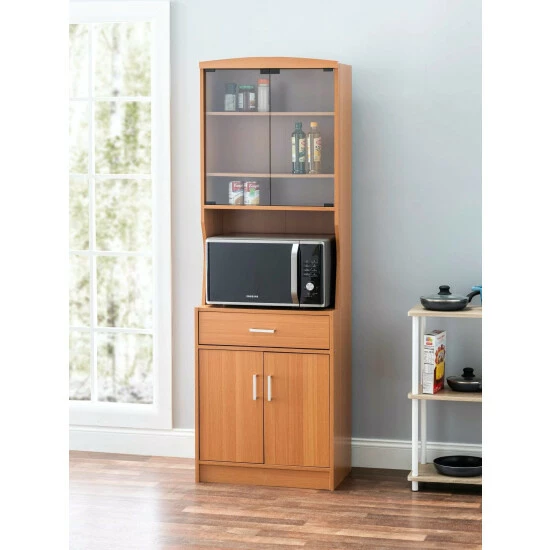 A fashionable and functional piece to add to your kitchen and dining room, this free-standing kitchen cabinet provides storage for pantry staples, frequently used kitchen tools and so much more. The center shelf gives you a designated space to store a microwave or toaster, while the top shelves are perfect for showcasing your fancy china and dishware. And a pull-out drawer keeps your flatware, spoons, and ladles neatly tucked away until your next recipe. For extra discreet storage, the two cabinet doors below open up to provide a home for small appliances, spare cleaning supplies, gadgets, and tools that you use occasionally.