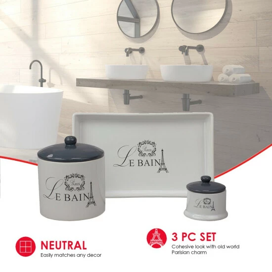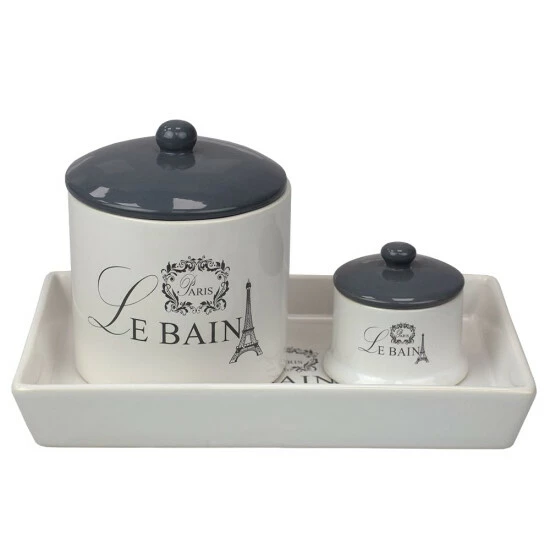 Refresh your bathroom with a touch of Old world parisian charm using this set of canisters with coordinating vanity tray. This handy canisters are great at keeping cosmetics, cosmetic pads, jewelry and other small toiletries and bath accessories neatly organized. Place on top of the vanity in the bathroom or dress up your bedroom dresser. It comes complete with a vanity to keep everything in place. Spot clean. For easy maintenance, simply gently wash the set with mild soap and water. Item dimensions may differ slightly form actual product due to manual measurement. Color and finish may also differ slightly from image due to differences in monitor displays. Props and accessories not included.