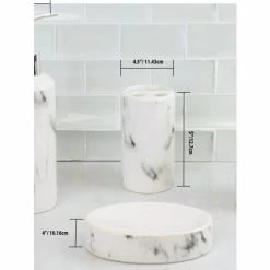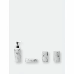 Give your bath a luxurious upgrade with the help of this 4 piece bath ensemble. Crafted from heavy duty ceramic with unique veining that resembles authentic marble, this four piece bath accessory set fuses together natural beauty with a modern twist. The set comes complete with a lotion dispenser, soap dish, tooth brush holder, and tumbler. Accessorize this set by placing each piece on one of our wide selection of bathroom vanity trays to keep your bathroom essentials beautifully displayed and organized during the morning rush. For easy maintenance, simply gently wash the set with mild soap and water. Item dimensions may differ slightly from actual product. Color and finish may differ slightly due to differences in monitor displays.