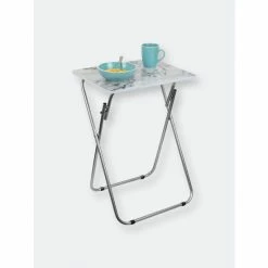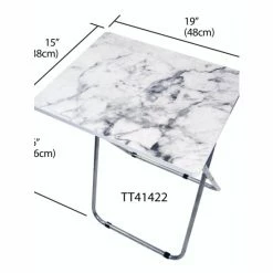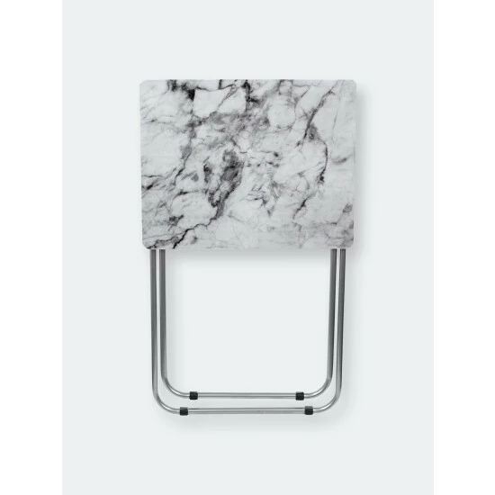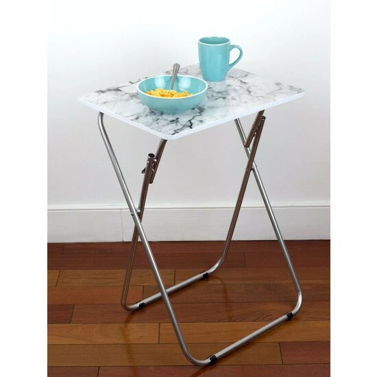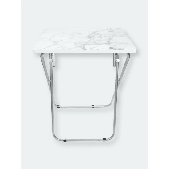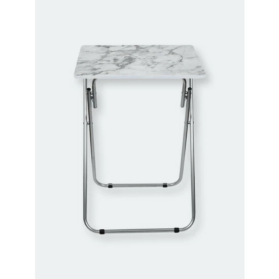Set a colorful selection of your finest cuisine on the smoothe marble surface of this folding multi-functional table. Then add in a set of leather seats in the equation and you’re sure to wow your guests with your penchant for all things posh and classy. The rich veined marble top, creamy white hues and smokey grey color scheme lends a contemporary flair, making it perfect to coordinate with a variety of decor. Equipped with steel legs and a MDF top, it’s perfect to use indoors or out. It easily folds to store away when not in use.