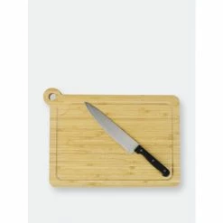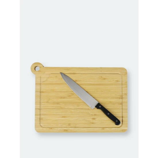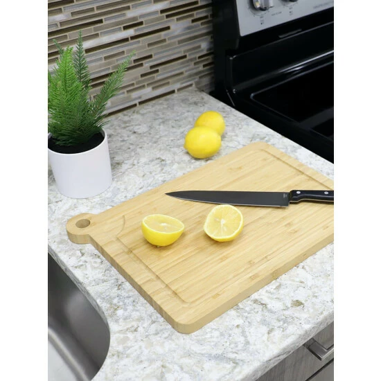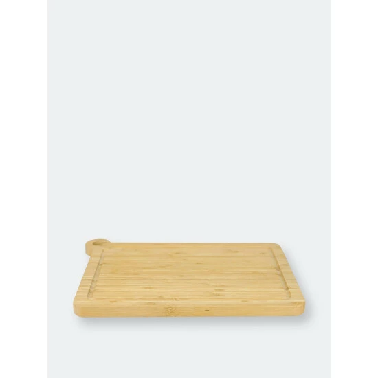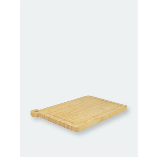 Keep juices contained while chopping and your knife’s edge razor sharp with this cutting board with drip groove. Built-in grooves are bordered throughout the board, helping prevent juices seeping out of resting meats, vegetables and fruits from dripping all over your counter. And its thick design keeps it as place as you slice, dice, mince, and chop away. With beautiful graining, this solid bamboo cutting board provides the perfect gathering spot for a grouping of grilled meats during backyard barbecues. The bamboo cutting board is easy to clean with just soap and warm water. Dry it thoroughly after washing. Apply food-grade mineral oil to keep it looking its best. When you’re done using it, you can simply hang the board by its cut-out rounded handle. Item dimensions may differ slightly due to the unique nature of the product. Color and finish may also differ slightly from the images shown due to differences in monitor displays. Props and accessories are not included.