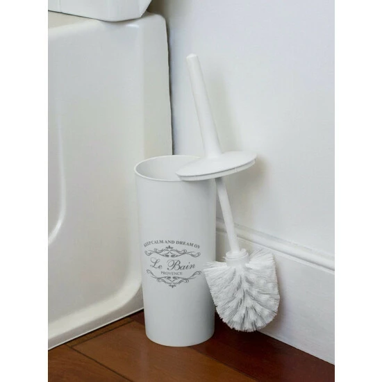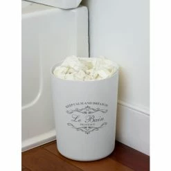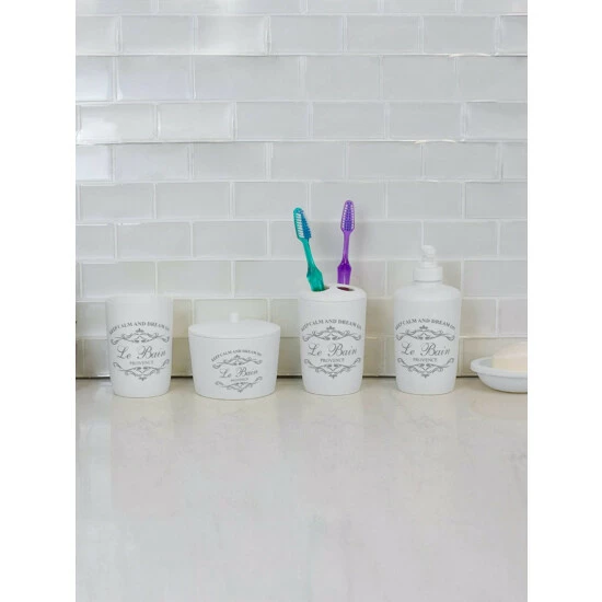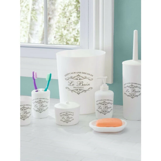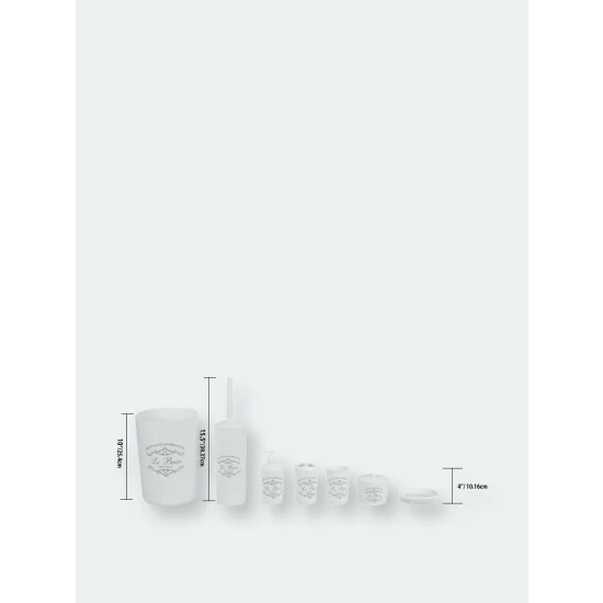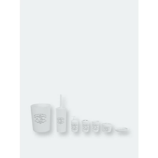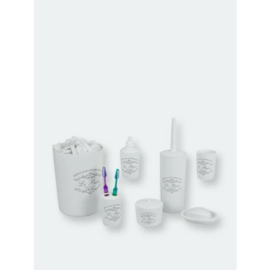 Welcome in this elegant 7 Piece Paris Bath ensemble to your humble abode and your well on your way to a creating your own relaxing French retreat. Each piece is crafted out of sturdy plastic and beautifully decorated with French provincial inspired script atop a crisp white hue, matching effortlessly with a granite or vanity tops. Use the tumbler for rinsing and drinking. Or place it on your desk at work to provide a chic way to corral your pens, pencils and other small office supplies. Store your toothbrushes in the holder to prevent clutter on your vanity. Place the soap dish in the shower to keep your bar soap handy. Or use in the bedroom to display all your jewelry and accessories. Set the lotion dispenser sink side in the kitchen or bath to add that certain je ne sais quoi. Tuck away the French inspired waste bin in the corner to neatly contain the clutter. Item dimensions may differ slightly from actual product. Color and finish may also differ due to differences in monitor displays. Props and accessories not included.