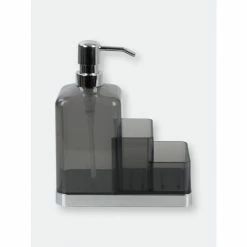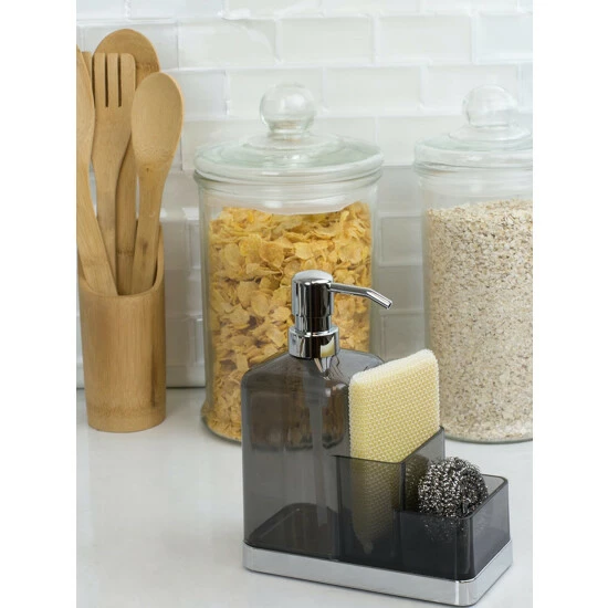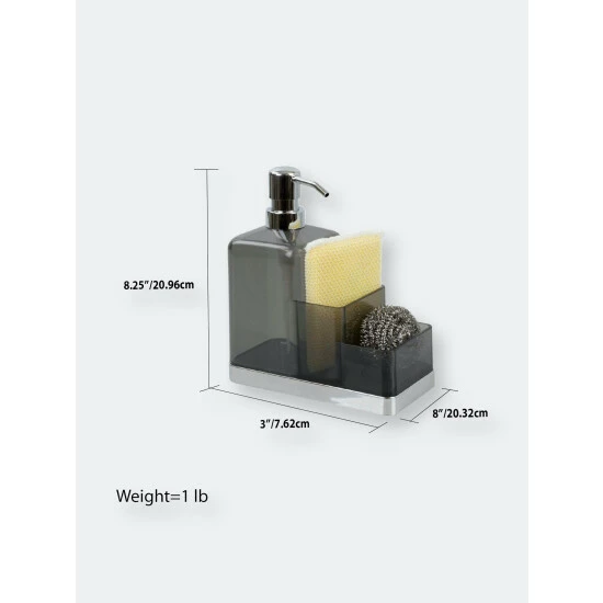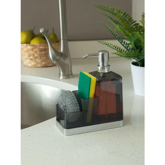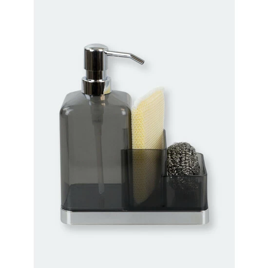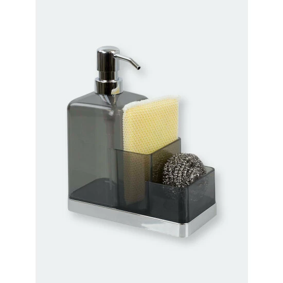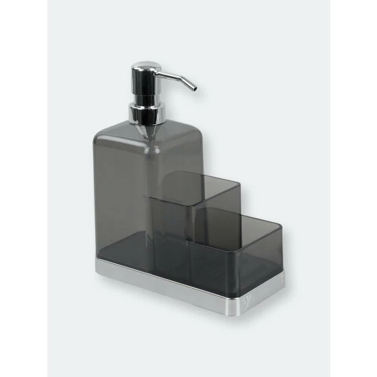 Instant storage for your kitchen sink. This plastic soap dispenser and sponge organizer is made from durable plastic, and features a transparent finish to easily known when its time for a refill. Fill the dispenser with liquid soap for hand washing. Use the compartments to keep sponges handy. Or fill it to the brim with lotion and use the compartments to display small accessories, like jewelry. The compact design allows it to sit perfectly alongside a narrow sink ledge or in a corner on a bathroom vanity or dresser.