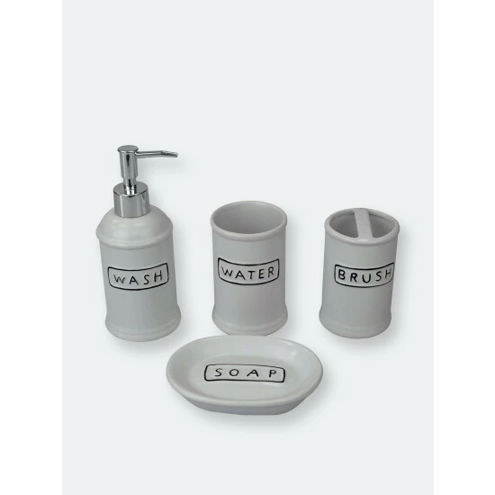 Bring resort-like comfort to your bathroom with this 4 Piece Bath Ensemble. The set comes complete with a lotion/soap dispenser, tumbler, toothbrush holder, soap tray. A great gift to give to friends and family. Perfect way to bring style and convenience to the bathroom vanity. Place in the office rest room to style up the space with a tranquil retreat-like ambiance. Item dimensions may differ slightly from actual product. Color and finish may also differ slightly from image due to differences in monitor displays. Props and accessories not included.