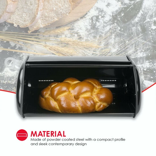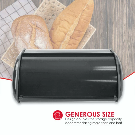 A countertop space saver, our roll top bread bins offer a compact profile and a contemporary sleek design. The large capacity provides plenty of room to hold up to two loaves and is great for storing muffins, batches of cookies or any baked goods you like. It opens and closes smoothly with a dark interior to keep your bread and baked treats super fresh. With its sleek style and protective trim, the bread bin will not only be lovely addition to the kitche but will also keep your surfaces protected from scratches.