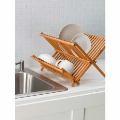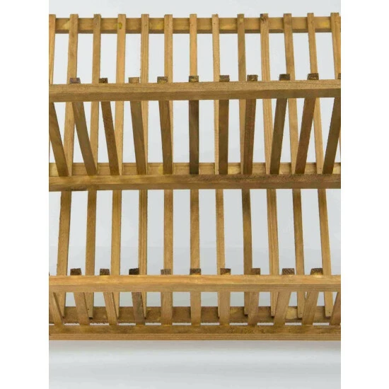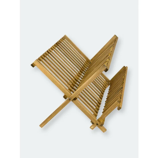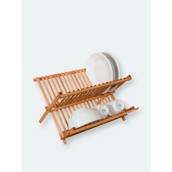 Save precious time from individually air drying each individual dish by placing damp dishware on this pine folding dish rack. This unique shaped dish rack features a minimalistic design that is visually appealing and a warm brown finish that brings a rustic flair to your countertops. The two level rack provides ample space to store cups, mugs, and bowls, while the multiple slots neatly stack plates upright for easy access. Folds flat for easy, compact storage when not in use.